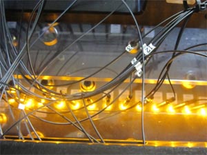 .Implementation of dedicated fixtures featuring integration of test circuitry, an optical fiber and a lens for each LED